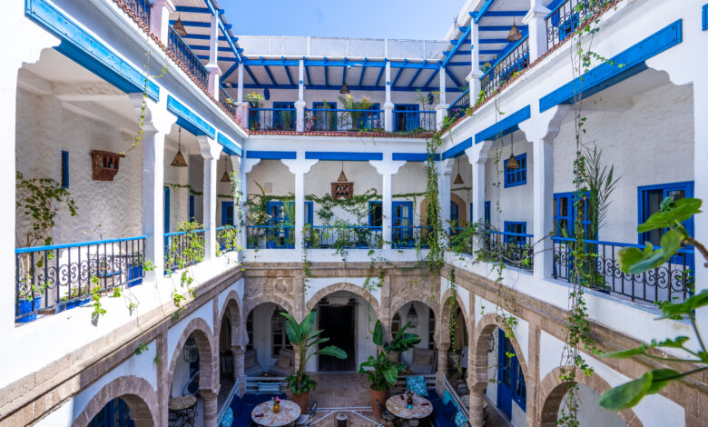 Patio central du Riad Al Madina à Essaouira, joyau historique de la médina. Entre arcades de pierre, murs blanchis à la chaux…