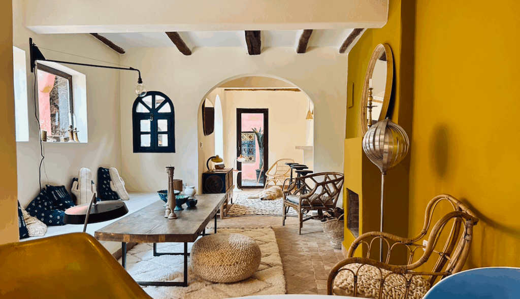 Le coin cheminée du salon bibliothèque dégage une atmosphère agréable et familiale pour les soirées fraiches. Les terrasses et espaces extérieurs vous offriront de très jolis moments cosy au soleil et à l’ombre. De quoi passer un séjour fabuleux dans une magnifique maison d’hôtes à Essaouira !